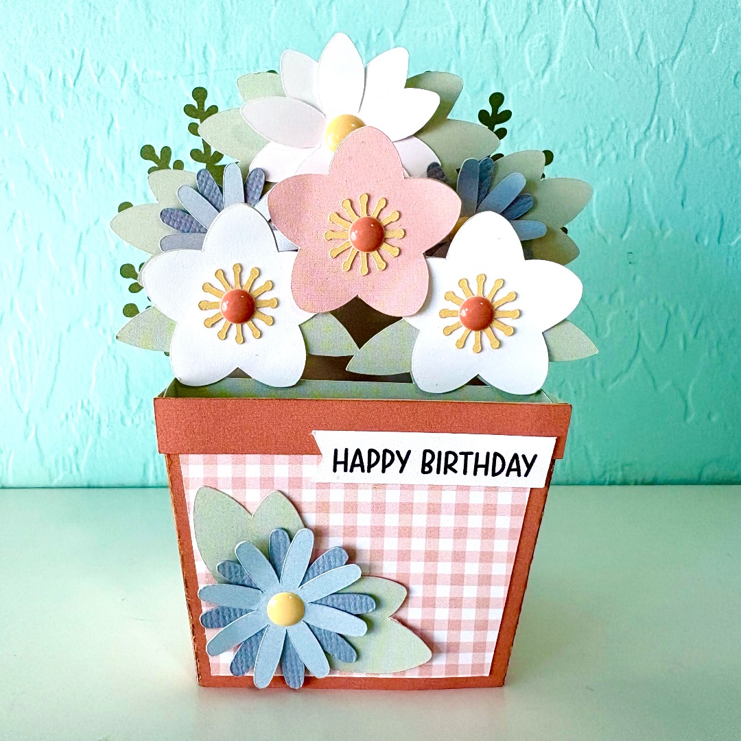 Hello crafty friends! Today I have a quick assembly tutorial for one of the new Flowerpot box cards. I used the Box Card Spring Flower Pot file (SVG, Silhouette). This file is so bright and cheerful. It has several print and cut sentiments so that it can be used for any occasion. I used the Happy Birthday sentiment, and the papers are from the Our Happy Place paper collection by Echo Park Paper Co.